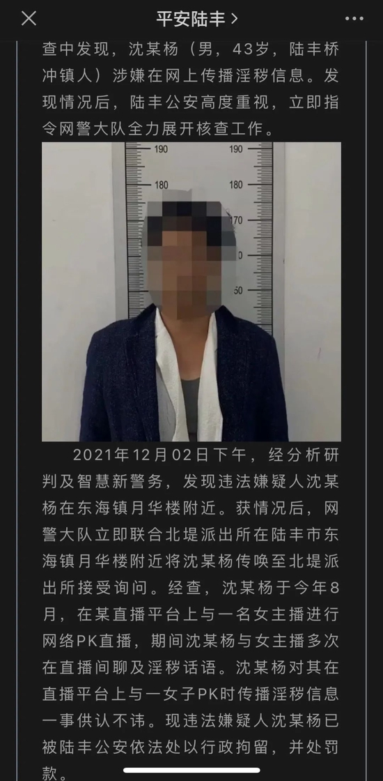 据警方消息,当地网警大队在网络巡查中发现,沈某某涉嫌在网上传播淫秽信息。经查,沈某某曾在某直播平台与一名女主播进行网络PK直播,期间沈某某与女主播多次在直播间聊及淫秽话语。沈某某被陆丰公安处以行政拘留,并处罚款。