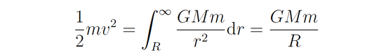 他先考虑了物体沿径向运动的情况。假设物体刚好以第二宇宙速度从地球表面沿径向逃逸,到了无穷远处这个物体的速度必须是零,否则它的初速度就不是最低要求的速度了。这时候引力做的功刚好抵消掉物体的动能,于是有: