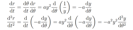 他强调,这是一个很简单的方程,其通解为y=A cos(θ+θ0)+ GM/a^2,其中A>0。并且,可以重新选取角坐标的原点使 θ0=0,将y代回到原形式1/r,可得: