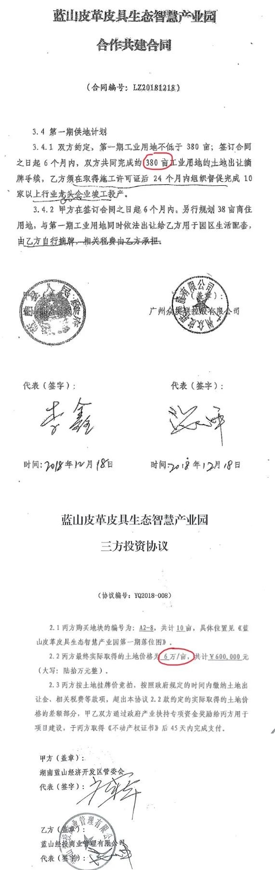 记者查看了当时签约的26家企业(丙方)与湖南蓝山经济开发区管委会、蓝山金投商业管理有限公司(众皮联和蓝山县政府成立的合资公司,共同招商主体)签订的蓝山皮革皮具生态智慧产业园三方投资协议。协议显示:“丙方最终实际取得的土地价格为6万元/亩。”记者查阅了2019年3月29日永州市国有建设用地使用权挂牌出让公告,公开信息显示,挂牌出让的蓝山县智慧皮具产业园相关地块单价则约在15万元/亩。
