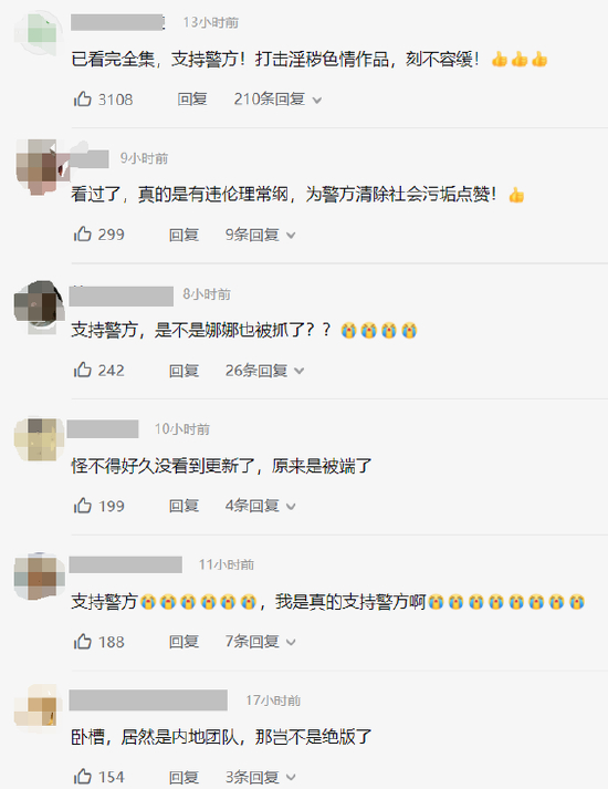 有网友表示“已看完全集,支持警方打击淫秽色情”。但在表态的同时,却掺杂了哭笑的戏份,诸如“是不是娜娜也被抓了”以及“原来这么久不更新是被端了”之类的讨论声不在少数。