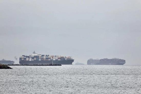2021年10月22日拍摄的在美国加利福尼亚州洛杉矶附近海域等待卸货的集装箱货轮