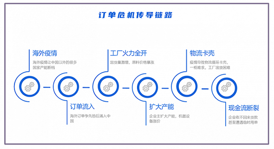 “海外疫情让中国以外的很多国家产能断档→海外订单争先恐后涌入中国→原材料价格暴涨→工厂火力全开→出货量激增→刺激企业主扩大产能→机器设备涨价→疫情导致全球物流循环卡壳→一柜难求→货物出不去→企业收不回来货款……”