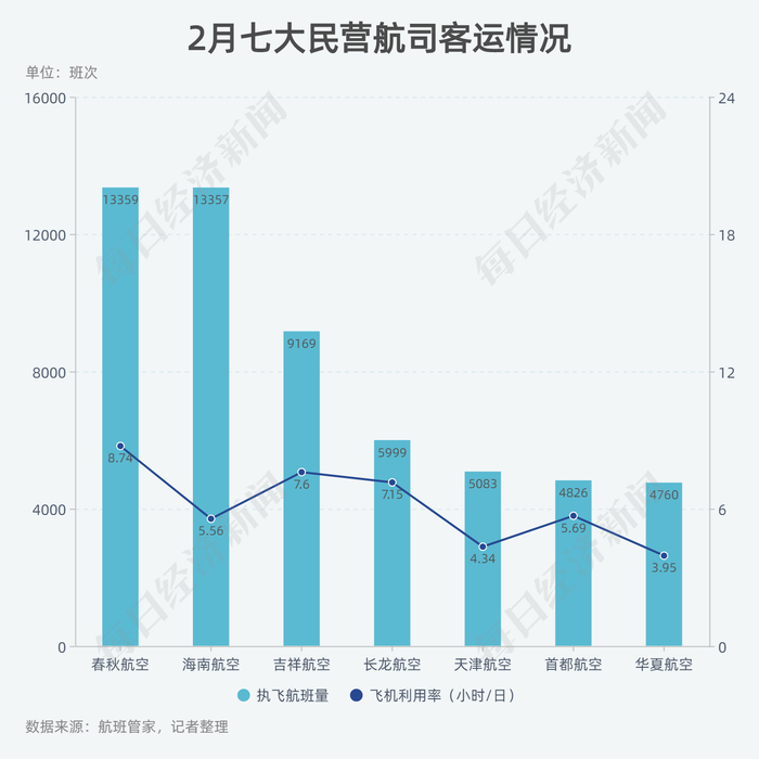 根据航班管家数据,七大民营航司中,2月执飞航班量由高到低分别为春秋航空、海南航空、吉祥航空、长龙航空、天津航空、首都航空、华夏航空。