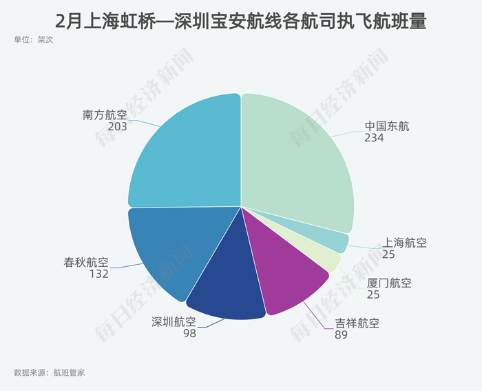 按航司划分,2月执飞上海虹桥—深圳宝安航线的航司有7家,按照2月执飞航班量由高到低分别为东航、南航、春秋航空、深圳航空、吉祥航空、厦门航空、上海航空,东航以234架次位列榜首。