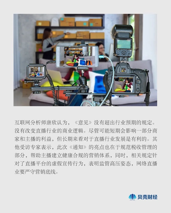 其他受访专家表示,此次《通知》的亮点也在于规范税收管理的部分,帮助主播建立健康合规的营销体系,同时,相关规定针对了直播平台的虚假宣传行为,表明监管高压姿态,网络直播业要严守营销底线。