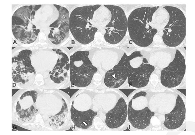 A-C为一名44岁男性患者CT;D-F为一名68岁男性患者CT;G-I为一名79岁男性患者CT。从左至右分别为发病时、随访2个月和随访1年。