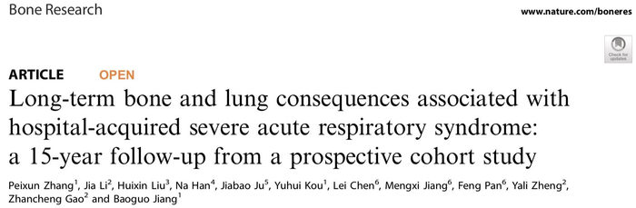 他们在研究中还对比援引了2003年暴发的SARS-CoV的一项长期随访研究。中国工程院院士、原北京大学人民医院院长姜保国和北京大学人民医院呼吸科与危重症医学科科主任高占成等人2020年发表于《Bone Research》的一项研究。研究提到,SARS康复后最严重的后遗症是股骨头坏死和肺纤维化,他们对SARS患者的肺部和骨骼状况进行了15年的随访。