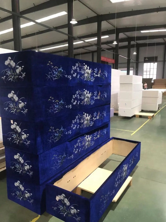 “我们雕好了以后,给镶嵌到棺材里面去。做好了以后,客户又让我们尝试去做棺材,给了一张图片和尺寸,我们加班加点地做了出来,客户一眼就看中了。”李如启说。