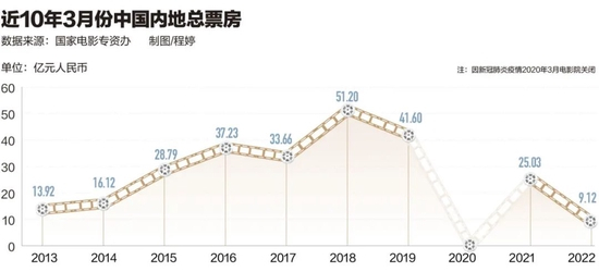 3月底之前,济南还没有收紧防疫政策,百丽宫影城的票房却跌到去年同期一半左右。影城总经理董文欣分析,今年春节比去年早,3月距离春节档比较远,春节档影片余热所剩无几。另外,新上映的大片也表现欠佳。去年3月,海外大片《阿凡达》和《哥斯拉大战金刚》接连上映,使得三四月这个传统淡季,每月也报收25亿元,而今年3月仅有9.1亿元入账。