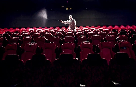 2020年3月25日,辽宁沈阳市比高电影院,工作人员在消毒。图/人民视觉