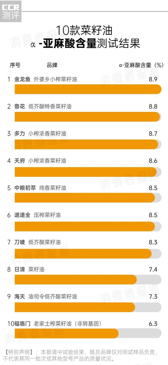 检测结果显示,10款菜籽油的α-亚麻酸含量在6.3%~8.9%之间,其中,福临门最低,金龙鱼最高。