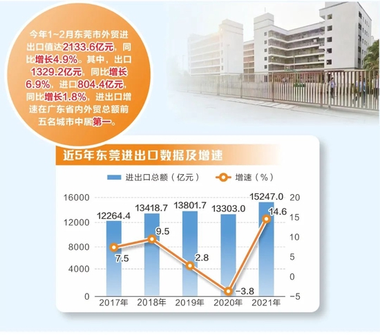 近日,东莞市统计局公布1~2月经济数据。受复杂严峻的国际环境、国内“三重压力”叠加本地疫情反复等影响,东莞经济稳增长压力较大。稳外贸就是稳经济,作为外贸大市,今年1~2月东莞市外贸进出口值达2133.6亿元,同比增长4.9%。其中,出口1329.2亿元,同比增长6.9%,进口804.4亿元,同比增长1.8%,进出口增速在广东省内外贸总额前五名城市中居第一。