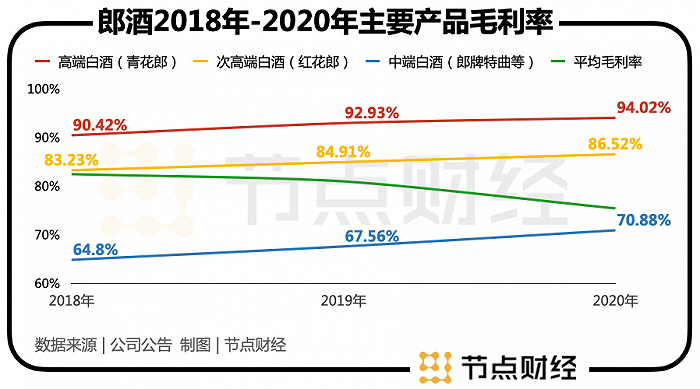 郎酒的产品收入也体现了这种结构。从2017年至2020年,其高端和次高端的收入占比从40%增长到了65%,其产品主要就是青、红花郎酱香酒。而从毛利率来看,据招股书显示,2020年郎酒的高端毛利率达94.02%,甚至压了茅台一头,而所有产品的平均毛利率也达到82.43%。