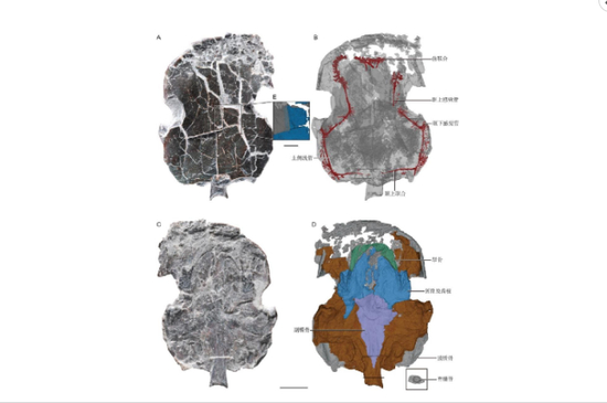 A,会泽滇双翼鱼正型标本(背视);B,会泽滇双翼鱼感觉管系统三维虚拟模型(背视);C,会泽滇双翼鱼正型标本(腹视);D,会泽滇双翼鱼膜质骨、犁骨、翼骨与副蝶骨三维模型虚拟(腹视)。(罗彦超供图)