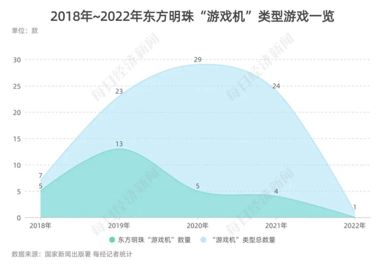 此外,据《每日经济新闻》记者统计研究,获得版号的“游戏机”类型游戏,背后的运营公司频频出现上海东方明珠文化发展有限公司的身影。2018年~2022年,共有84款“游戏机”游戏获批版号,其中,有27款游戏背后的运营公司为东方明珠。