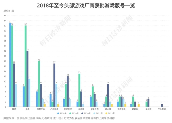 但拉长时间轴来看,腾讯、网易等游戏大厂获得游戏版号的数量名列前茅。据《每日经济新闻》记者统计,国家新闻出版署官网上,腾讯作为运营单位的游戏版号有345个,最近一次取得版号的时间为2021年6月;网易则有209个,最近一次获得版号的时间为2021年7月。