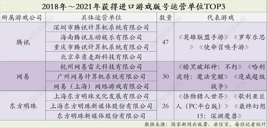 此外,记者注意到,腾讯和网易作为游戏产业两大巨头在进口游戏领域也保持着领先地位。2018年~2021年,腾讯系和网易系企业分别获得进口游戏版号47款和30款,产品包括2021年在市场上引发关注的《英雄联盟手游》和《哈利波特:魔法觉醒》。获得进口版号数量排名第三的为东方明珠,近年来共获得进口游戏版号26款。