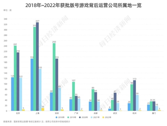 从获批游戏的区域分布上来看,2018年至今获批的近6000款游戏,背后的运营公司主要位于一线城市,其中占比最多的是上海、北京、深圳。