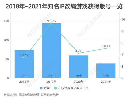 据记者粗略统计,2018年~2021年在获批游戏中,知名IP改编游戏分别为73款、144款、59款、38款,在获批版号总量中占比并不高,且数量持续下降。
