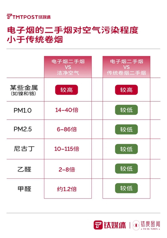 数据显示,电子烟在燃烧后平均有害物质比卷烟更低;其产生的二手气溶胶含有多种有毒物质,是一种新的空气污染源,不过污染程度略低于传统卷烟。