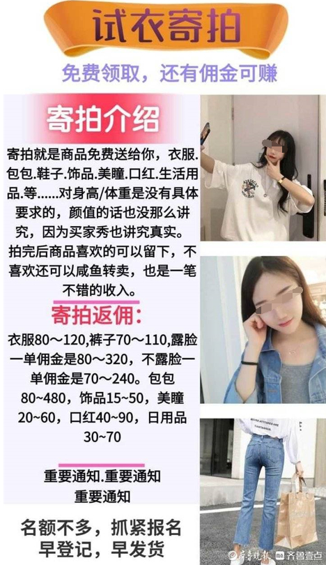 该信息显示,所谓的“试衣寄拍”就是招聘方将女式衣服、鞋子、皮包等商品以邮寄的形式寄给兼职者,之后兼职者进行试穿或试用,并将试穿或试用的照片发送给招聘方,最后招聘方向兼职者支付薪水。