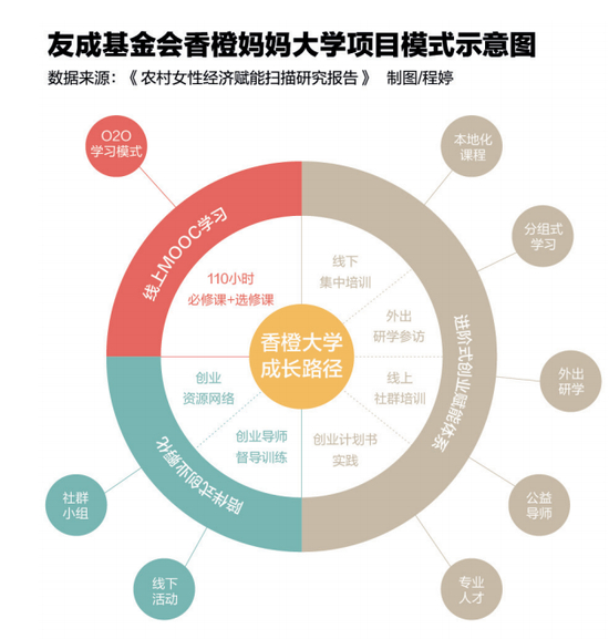 按照香橙妈妈的设计,每年每县一个培训班,成本大概在50万元左右,平均每位学员投入1万元,包括线上线下的课程,后期的孵化和研学费用,这些成本全部由友成和捐赠人承担。