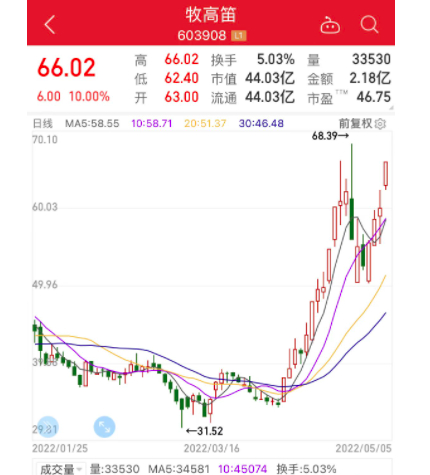 亮眼的业绩也拉动了牧高笛的股价,4月份,牧高笛的股价从35.07元/股一路走高,截至4月29日报收60.02元/股,股价涨超71%。红星资本局注意到,5月5日开盘不久,牧高笛随即涨停,报66.02元/股。