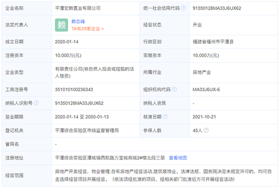 企业查询网站信息显示,平潭宏新置业有限公司成立于2020年01月14日,注册资本1亿元,注册地位于平潭综合实验区潭城镇西航路万宝城商城2#楼北段三层,法定代表人为赖志峰。经营范围包括房地产开发经营,物业管理,自有房地产经营活动,建筑装饰业。法律法规、国务院决定未规定许可的,均可自主选择经营项目开展经营。