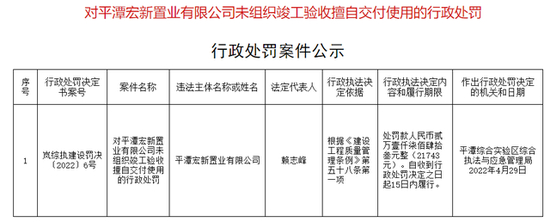 乐居新媒体 孙萌 发自福州 日前,平潭综合实验区综合执法与应急管理局发布“对平潭宏新置业有限公司未组织竣工验收擅自交付使用的行政处罚”。
