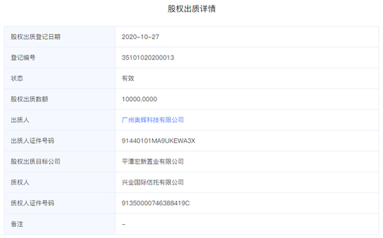 此外,平潭宏新置业有限公司目前共有多达4亿人民币的股权被福州市中级人民法院执行,处于冻结状态。2020年10月下旬,其母公司广州奥辉科技有限公司还向兴业国际信托有限公司出质数额为10000的股权。
