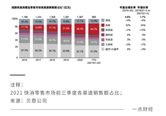 根据贝恩报告,去年第三季度中国快消品的总体增速同比下跌0.8%。除便利店以外,各个线下渠道的销售额均呈下跌之势。