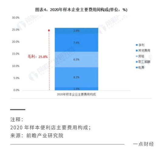 在一二线城市,房租、人力成本不断上升,业绩天花板不断被压低。根据前瞻产业研究院的数据,便利店的职工薪酬与房租占总费用6成以上,企业净利仅2.4%。