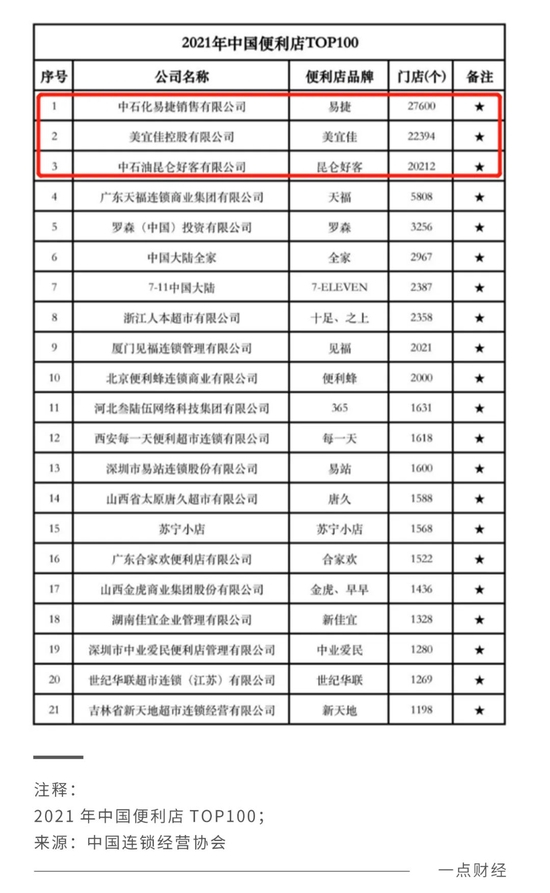 据中国连锁经营协会发布的《2021中国便利店TOP100榜单》(下称<榜单>),在门店数量上,本土系中的易捷(2.76万家)、美宜佳(2.24万家)、昆仑好客(2.03万家)分别位于前三甲。