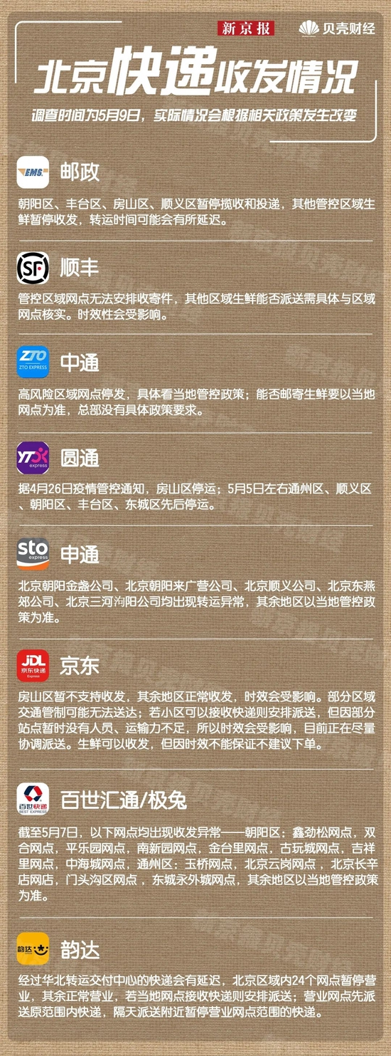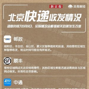 随着北京最新防疫措施出台,快递收发成为市民关注的焦点。截至5月9日,北京疫情仍处在高位平台期,防控形势严峻复杂。为尽快实现社会面清零,市内划定多处封控区、管控区、临时管控区。疫情之下,北京快递状况究竟如何?9日,新京报贝壳财经记者先后咨询了邮政、顺丰、京东和四通一达等8家快递公司,对涉及北京多地的物流情况进行求证,并梳理最新情况。