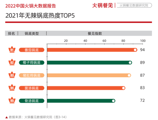 而2021年无辣锅底热度排名前5中,除却常见的番茄、菌汤、骨汤,椰子鸡与猪肚鸡赫然挤进了前三。