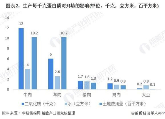 植物肉能够在一定程度上减少环境污染,以植物蛋白素肉为例,每生产1kg的大豆排放约0.2千克二氧化碳,消耗0.8立平方米和使用0.1百平方米的土地面积。