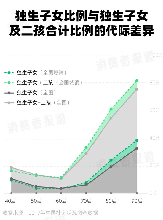 与此同时,也是在改革开放初期,中国开始推行对Z世代产生重大影响的独生子女政策。根据中国社会科学院社会学研究所2017年中国社会状况调查数据,“60后”和“70后”人群中独生子女比例极低(分别为4.3%和6.8%),80后和90后独生子女比例则较高(19%和32%),国家统计局2018年的数据显示,00后人群中独生子女比例甚至高达60%,其中多数来自城市家庭的“Z世代”是独生子女,多数来自农村家庭的“Z世代”是二孩。