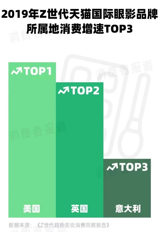 在美妆上,相较于其他世代,Z世代的选择也更加大胆,颜色越夸张越买账。《Z世代趋势美妆消费洞察报告》显示,Z世代对多色盘的偏好度最高,尤其是八色及以上的多色盘消费占比显著提升,这种专业式的眼影盘已是Z世代的主流选择。在整体妆容上,过去流行的日韩淡妆正在退潮,逐渐被“浓颜”欧美妆取代。2019年,美国成为了天猫国际Z世代消费增长最迅速的品牌所属地。