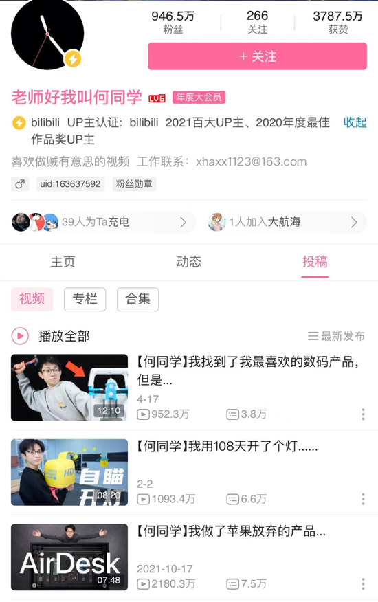 以B站UP主“老师好我叫何同学”为例,作为一名资深果粉,他早期的视频多以苹果古早的产品为主。2019年6月,这位就读于北京邮电大学的99年的大二学生凭借着一则5G测评视频在2 天之内涨粉超过 40 万,成为当年的B站百大UP主之一。据了解,在市面上,一个B站600万粉丝级别的up主视频报价基本在百万级别,目前他已经在B站吸引超过946.4万粉丝,其采访苹果CEO蒂姆·库克一度成为微博热点话题。