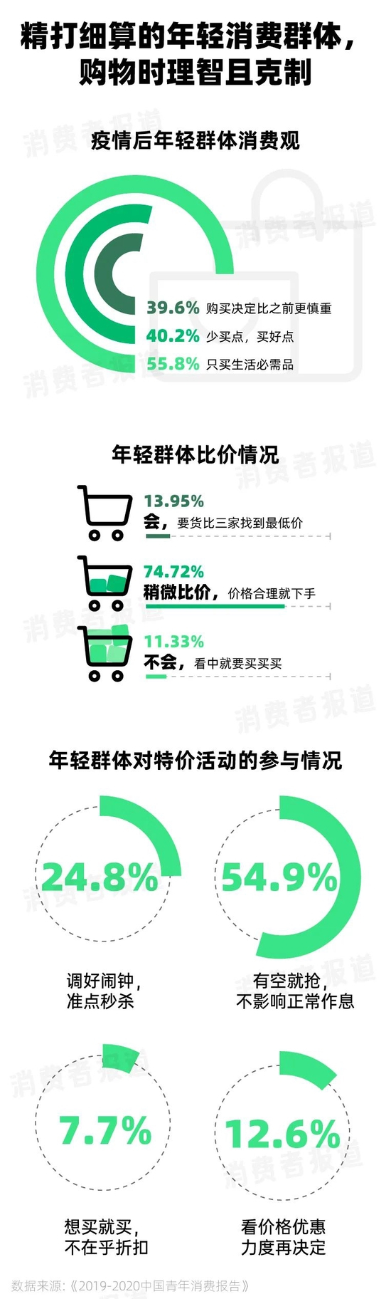 出生于这一时期的年轻人,对网络信息有极强的获取、筛选、分析能力,这一特性在他们的消费过程中成为了一项省钱利器。为了对得起自己花出去的每一分钱,入手一件产品,他们研究各类测评,精读各平台差评,点大图看细节结合评价判断质量,货比三家找到最低价。数据显示,近九成用户会比价后再购买,近八成用户会参与特价活动。