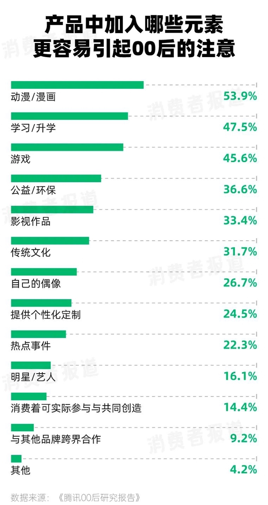 《腾讯00后研究报告》显示43%的00后愿意为自己的兴趣投入很多时间和金钱。77%的00后容易为有自己熟悉/喜欢元素的产品付费。与动漫/漫画、学习/升学、游戏等方面内容元素相结合的产品,更容易引起00后的关注。