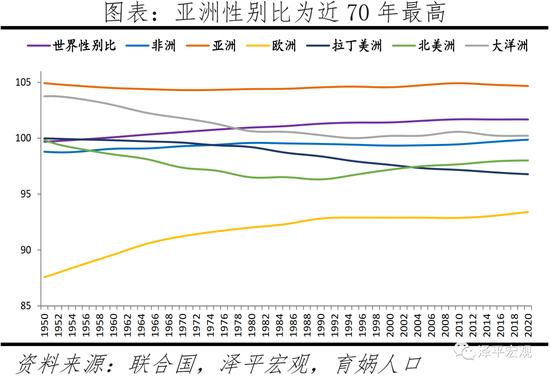 世界人口性别比呈上升趋势,2020年为101.7,亚洲受“父系血统”逻辑影响,“重男轻女”思想仍存,性别比最高;欧洲受二战影响男性伤亡较多,性别比最低,至今未恢复平衡。1950-1958年,世界男性人口数略少于女性,性别比在99.6-100.0之间;1958-2008年,性别比由100.0上升至101.7;2008-2020年性别比保持在101.7左右。1950-2020年世界男性出生人数比女性多2.8亿,男性死亡人数比女性多2亿,世界性别比近年来不断增加是由于新生儿男性数量增加抵消了寿命较低的负影响。
