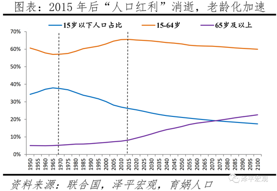 2)1970-2015年,少儿人口占比下降至26.2%;随着1950-1970年出生人口年龄不断增加,“人口红利”显现,劳动年龄人口占比增加至峰值65.6%,其中亚洲“人口红利”最明显,此阶段世界劳动年龄人口增量的66.7%发生在亚洲;老年人口占比保持较低水平,由5.3%缓慢升至8.2%,每年增长不到0.1个百分点,世界人口进入老龄化阶段。
