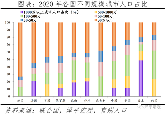 从具体国家看,德国、英国城市人口目前主要集中在小城市,30万以下城市人口占比分别为73%、54%,没有1000万以上的城市。德国大中小城市的基础设施、工作机会、社会保障等条件差距较小,城市化表现为“去中心化”;日本的城市人口主要集中在超大城市,1000万以上城市人口占比49%,而30万以下城市人口占比仅20%。