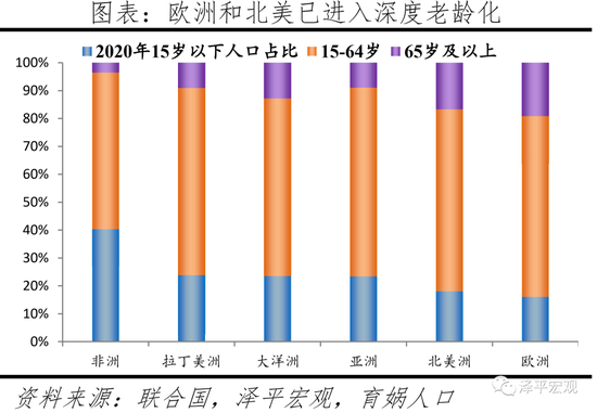 分区域看,欧洲和北美洲已进入深度老龄化阶段,预计大洋洲、亚洲和拉丁美洲将在2025年后陆续进入深度老龄化阶段。2020年,非洲劳动年龄人口占比仅56.1%,随着少儿逐渐进入工作年龄,非洲人口红利将逐渐显现。非洲老年人口占比最低,为3.5%,未进入老龄化;亚洲、拉丁美洲和大洋洲老年人口占比分别为8.9%、9.0%和12.8%,已经进入老龄化;北美洲和欧洲人口老龄化最严重,老年人口占比分别达16.8%和19.1%,进入深度老龄化。根据联合国预测,亚洲进入老龄化速度将快于欧洲和北美洲的速度。