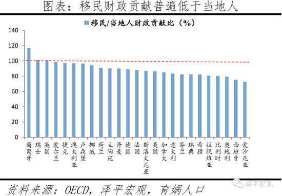 2)迁入国引进低质量移民也会拖累对经济增长,OECD国家移民和当地居民财政贡献比普遍低于1。高福利国家负担移民的福利保障,却难以收回与当地人对等的财政回报。比利时国家银行的报告显示,由于移民的低就业率,移民相对当地人有较低的财政贡献。根据OECD数据显示,仅葡萄牙移民财政贡献比大于1,爱沙尼亚、西班牙、奥地利的移民财政贡献比小于0.8。同时移民就业率低于当地人,会增加总体人民的失业率。所以移民虽然增加人力,但是如果移民的人均产出低于本土人民,也会拖累经济增长。