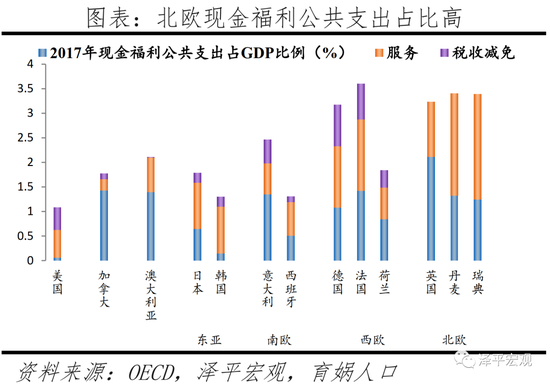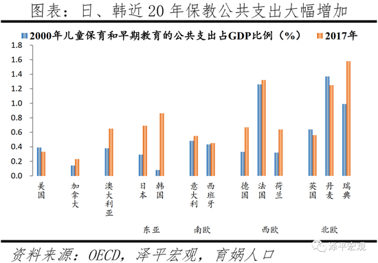 2)从生育成本看,一方面生育阻碍女性的人力资本积累与职业发展,导致生育机会成本增加。在学历“内卷”的时代,女性受教育水平提高,1970年至2019年高等院校女生入学占比由8.2%增加至41.7%,技术进步解放体力劳动,更多女性能参与劳动市场,但是性别不平等会影响生育意愿。OECD数据显示,2018年OECD国家中全职男性员工收入中位数比女性高12.8%,其中极低生育水平国家韩国全职员工收入性别差距高达34.1%,日本则为23.5%,而总和生育率回升至1.8的北欧国家丹麦、瑞典全职员工收入性别差距仅4.9%、7.1%。OECD国家数据显示,男女劳动参与率差异越小,总和生育率越高。另一方面,育儿成本高昂抑制生育行为。婴幼儿照料占据家庭大量时间成本和财务成本,OECD国家通过政府新建托幼机构和鼓励私营托幼机构发展来支持生育,2018年OECD国家大部分0-2岁入托率在10%-60%之间,平均为36.0%,且入托率越高,生育水平越高。同时,OECD国家还发放生育经济补贴。2017年大部分OECD国家家庭福利开支占GDP比例在1%-4%,其中法国为3.6%、比重最高。家庭福利开支比例与生育水平成正比,家庭福利开支占比越高的国家,生育水平越高。整体看,北欧国家家庭福利支出占比普遍高于南欧和亚洲其他发达国家,生育水平也相对较高,2015-2020年北欧、南欧、东亚总和生育率分别为1.8、1.4、1.7。
