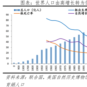 2)1770-2000年:高出生率、低死亡率的高增长阶段。1770-1950年人口由8亿快速增至25亿,年均增速6.4‰,1950-2000年人口由25亿增至61亿,年均增速达18‰。从死亡率看,工业革命后经济繁荣和技术进步带来生活和医疗条件改善,死亡率大幅降低,1950-2000年粗死亡率由19.1‰降至8.5‰,婴儿死亡率由14%降至4.9%,人类预期寿命由1950年的45岁(男)、48岁(女)增至2000年65岁(男)、69岁(女)。从出生率看,1950-2000年粗出生率由36.9‰降至21.0‰,保持在较高水平。