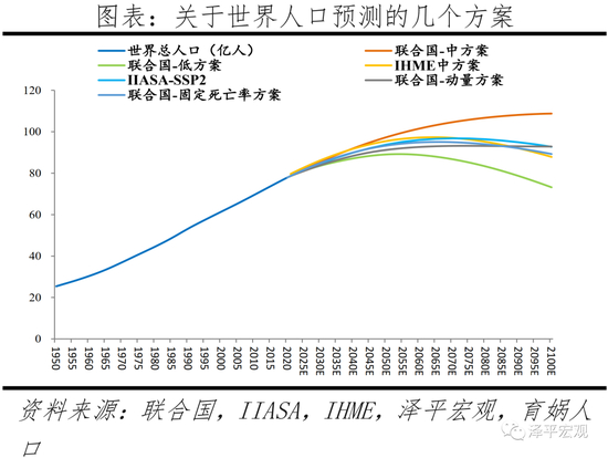 1)总量:高增长转为低增长,且人口重心逐渐南移。联合国《世界人口展望2019》对人口规模有9个预测,其中,中方案、动量方案、固定死亡率方案、低方案预测世界人口分别在2100、2074、2066、2054年达峰值109亿、93.2亿、95.1亿、89.2亿人。IIASA和IHME的中方案预测世界人口分别在2070年、2061年达峰值96.8亿和97.3亿人。